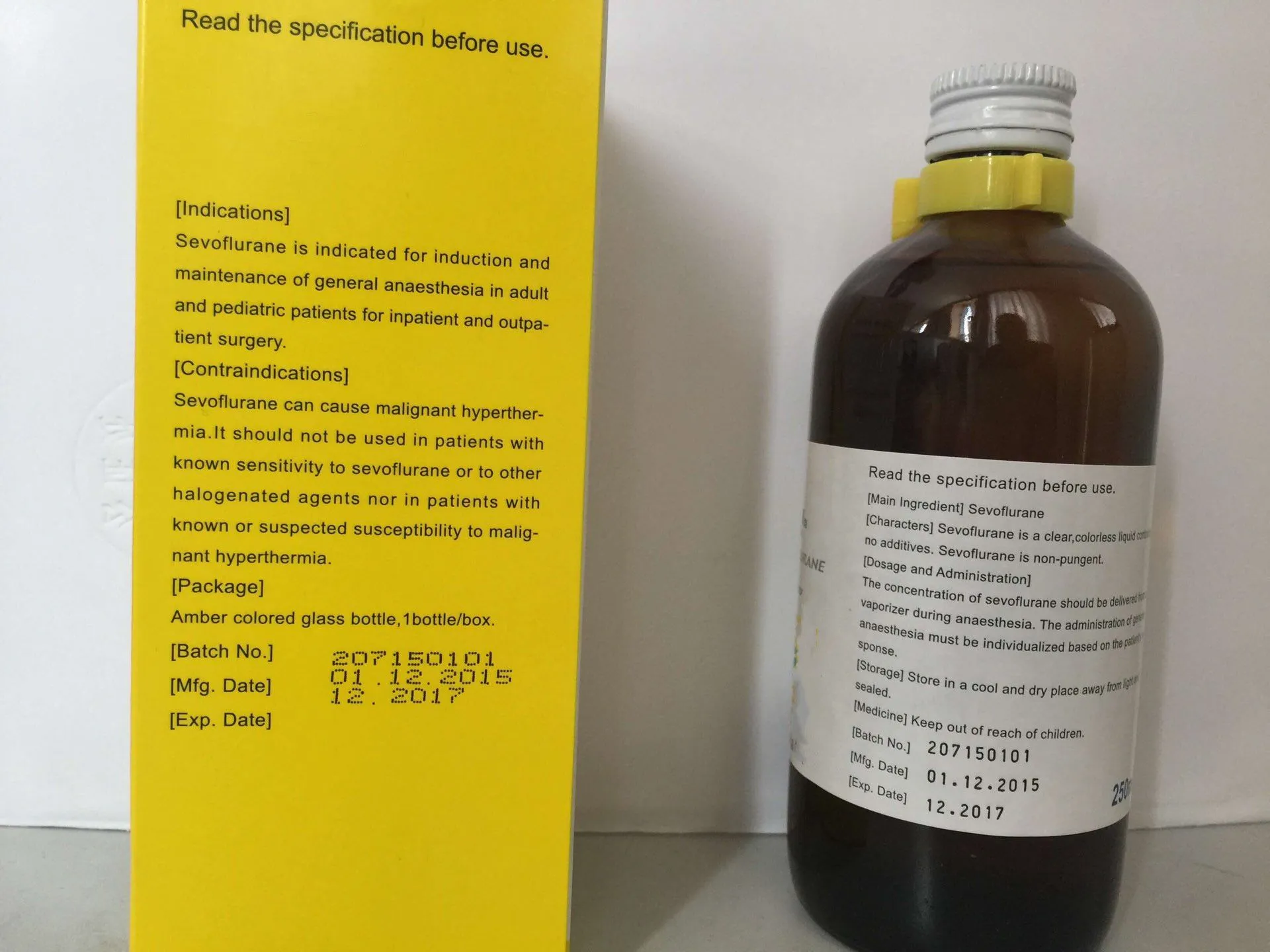 Sevoflurane is a colorless and transparent liquid that does not contain additives or chemical stabilizers. It has no corrosive effect on stainless steel, brass, aluminum, nickel plated brass, chrome plated brass, and copper beryllium. Non irritating, it is miscible with ethanol, ether, chloroform, and benzene, and slightly soluble in water. Its samples can be stored stably under normal room lighting conditions as required.